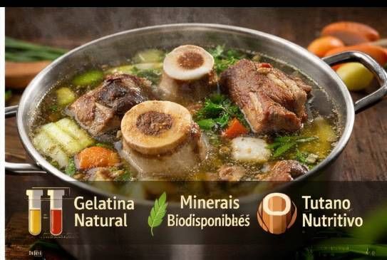 Estamos falando de ossos longos bovinos (canela, joelho, ossos com tutano), preparados em cozimento lento, com o uso de vinagre, para favorecer a extração de minerais e nutrientes estruturais.